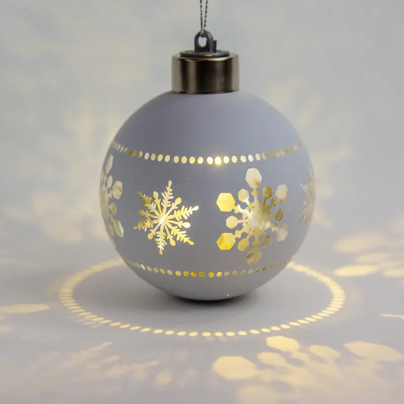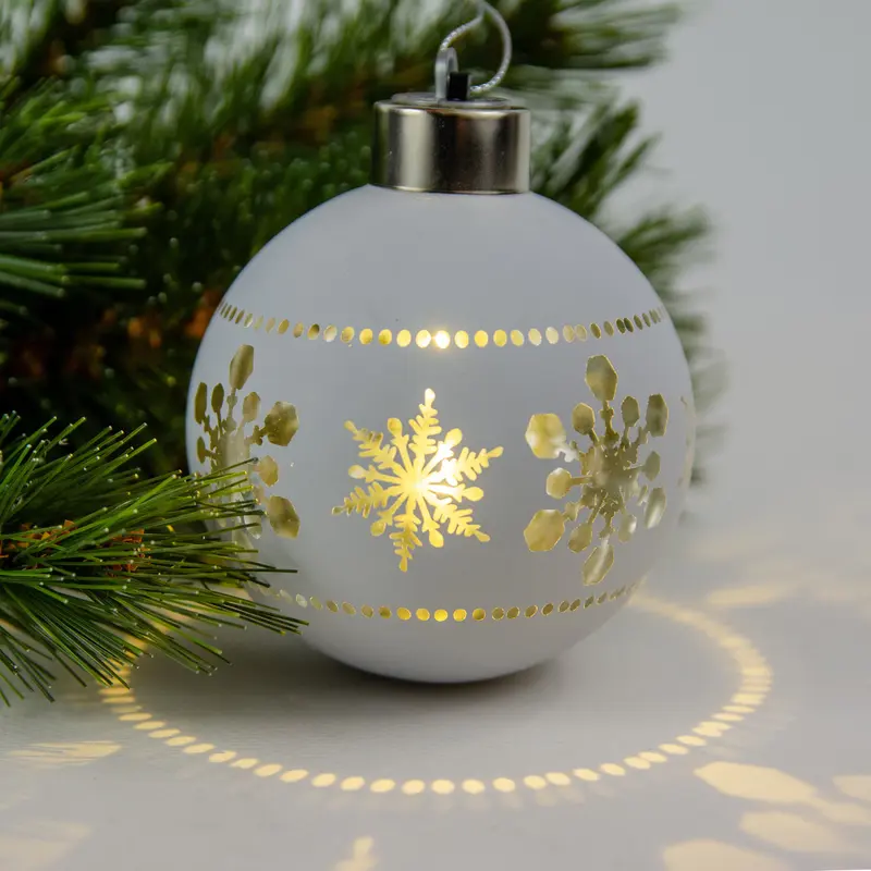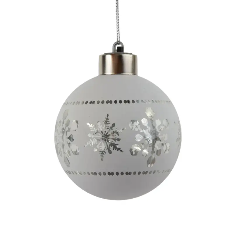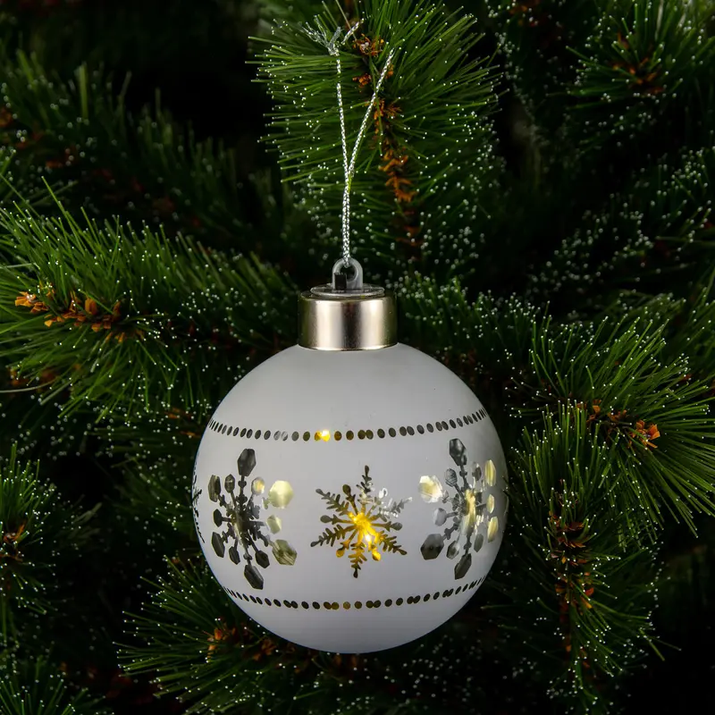 Ялинкова скляна кулька Chomik біла з LED підсвіткою 8 см, сніжинки в ряд