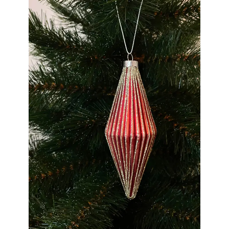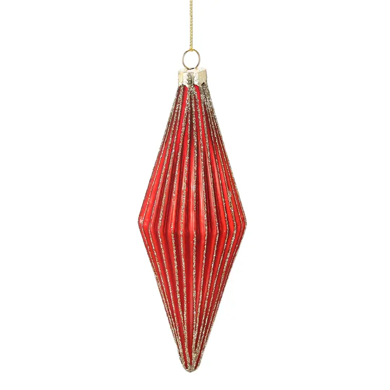 Ялинкові прикраси — невіддільний новорічний елемент декору, без якого складно уявити різдвяну атмосферу. Скляна червона ромбічна об'ємна фігурка висотою 14 см стане чудовим доповненням у оздобленні новорічного дерева, а також вдало скомбінується з іншими колірними гамами. Матова рельєфна поверхня та повздовжні лінії, покриті блискітками кольору шампань, додають виробу оригінальності й особливої чарівності. А придбавши кілька одиниць даного товару, можна створити привабливу акцентну композицію на новорічному дереві. *Реальний колір товару може дещо відрізнятися від зразків представлених на сайті залежно від технічних налаштувань Вашого екрану, а також, зважаючи на особливості матеріалу, відтінок товару може змінюватися залежно від освітлення.