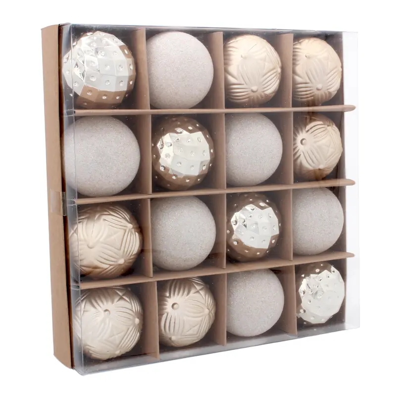 Ялинкові кульки — невіддільний новорічний елемент декору, без якого складно уявити різдвяну атмосферу.Особливістю набору є різноманіття покриттів та текстур (матові рельєфні - 6 шт; глянцеві рельєфні - 4; з блискітками - 6) пластикових кульок, представлених у стильному відтінку* шампань, що дозволяє вишукано оздобити новорічне дерево у повноцінну святкову композицію. Структурна рельєфна поверхня додає кулькам оригінальності та шарму, а покриття блискітками забезпечує казкове сяйво при потраплянні світла на прикраси. Комплект особливо вдало виглядає на фоні зеленої хвої, а також впишеться у будь-який інтер'єр — залишається лише вдягнути іграшки на вашу ялиночку!*Реальний колір товару може дещо відрізнятися від зразків представлених на сайті залежно від технічних налаштувань Вашого екрану, а також, зважаючи на особливості матеріалу, відтінок товару може змінюватися залежно від освітлення.