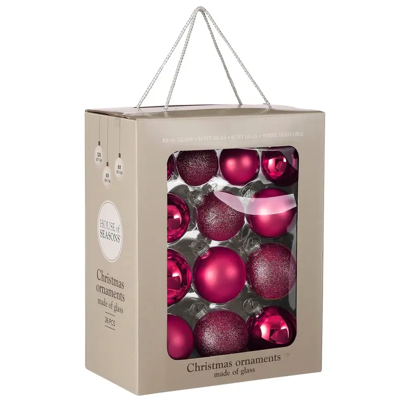 Ялинкові скляні кульки "House of Seasons" комплект 26 шт, Ø 7/6/5 см, фуксія