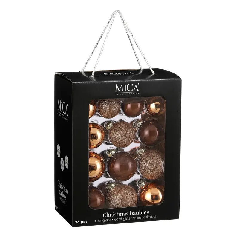 Ялинкові скляні кульки Mica Decorations компл. 26 шт, Ø 7/6/5 см, шоколад