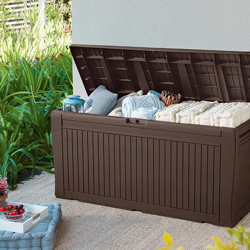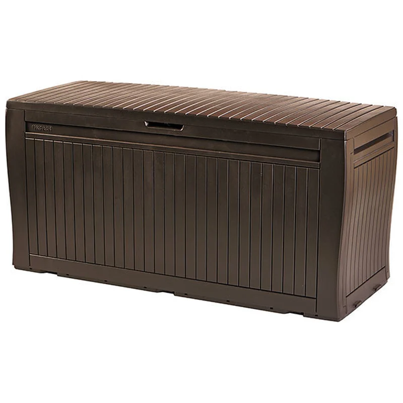 Скриня пластикова, імітує деревину. Comfy Storage Box 270 - це стильне доповнення до комплектів садових меблів виробництва групи компаній KETER. Не має значення, що Ви зберігатимете в скрині: подушки від меблів, іграшки, садове приладдя або щось інше - вміст залишається сухим і добре вентилюватиметься. Крім того, скриня, що закривається, тому вміст буде в безпеці. Завдяки наявності коліс і ручок в корпусі, скриню можна перевозити в інше місце без особливих зусиль.