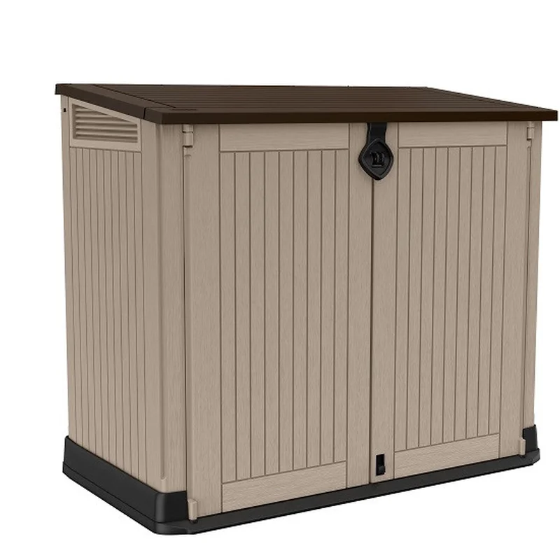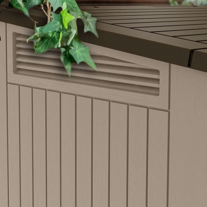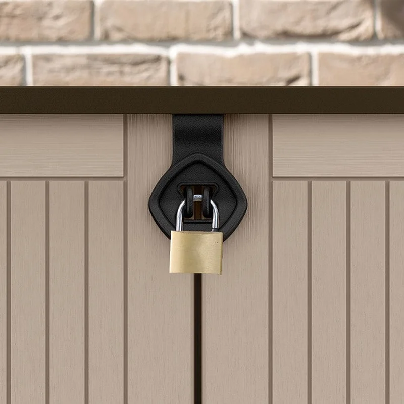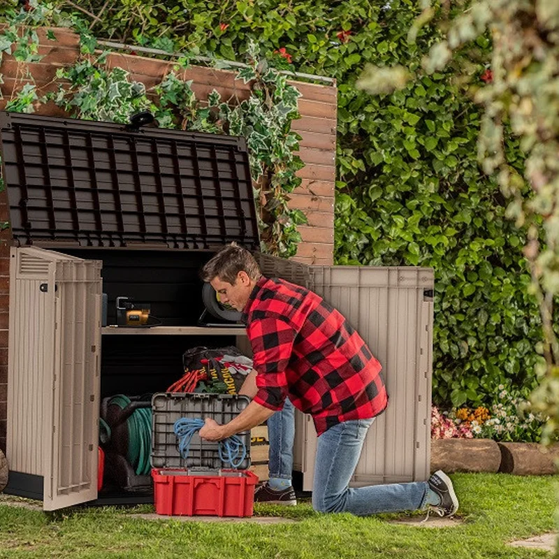 Завдяки габаритним розмірам, в ящику багато простору для зберігання важкого обладнання та інструментів: газонокосарки, барбекю, садових меблів, садового інвентарю, а також великих сміттєвих баків - конструкція передбачає кріплення кришок сміттєвих баків до кришки ящика для зберігання, яке спрощує використання і відкриття скриньки для викидання сміття. Поріг ящика має закругляющуюся форму, завдяки чому габаритні предмети легко поміщати всередину. Перед монтажем скриньки важливо підготувати поверхню згідно рекомендацій виробника - ретельно очистити і вирівняти, це забезпечить тривалу і правильну експлуатацію виробу.