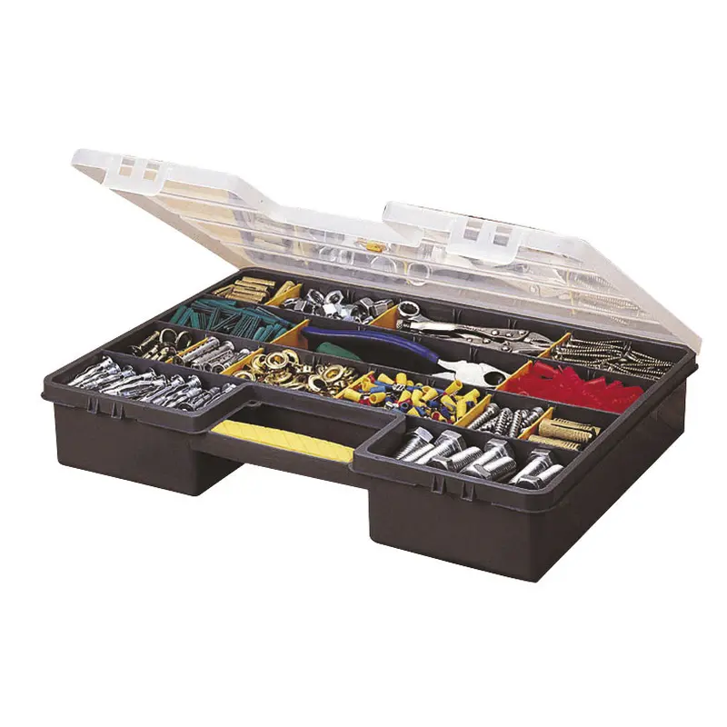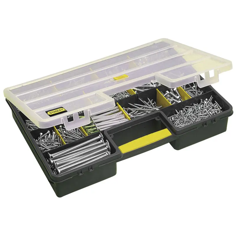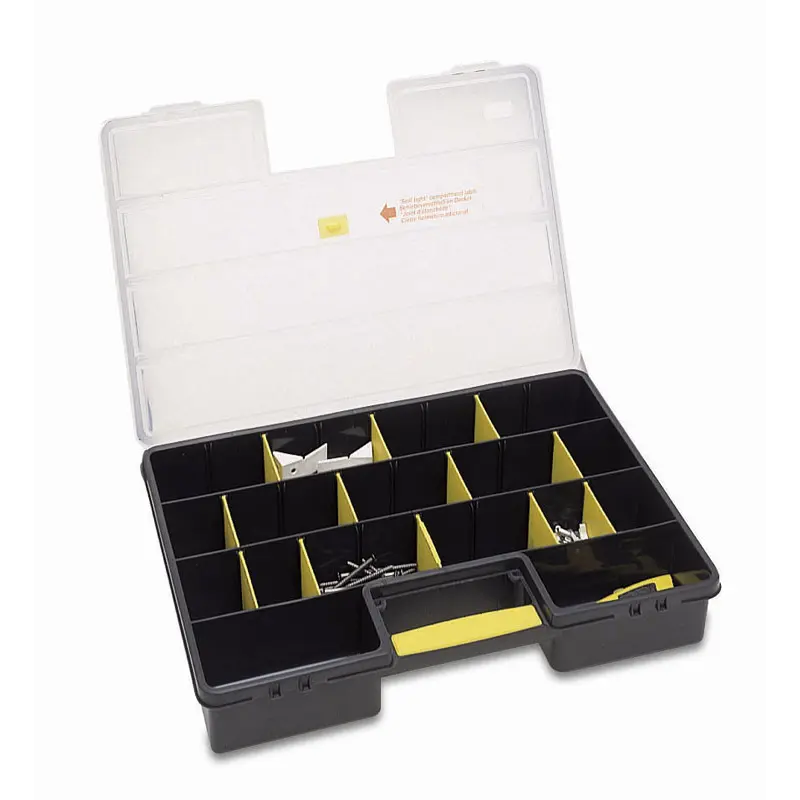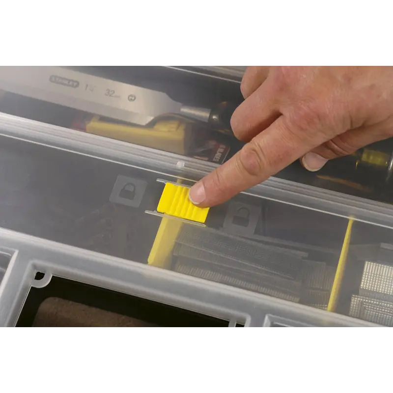 Ящик органайзер (кассетница) 25 осередків 46х33.5см STANLEY 1-92-762 - Органайзер "199" з 25-ма відділеннями, 457х330х81мм- Легка пластикова конструкція- Прозора кришка- Лита пластмасова накладка на ручку - Зсувний фіксатор кришки- Кришка фіксується- Переставні перегородки