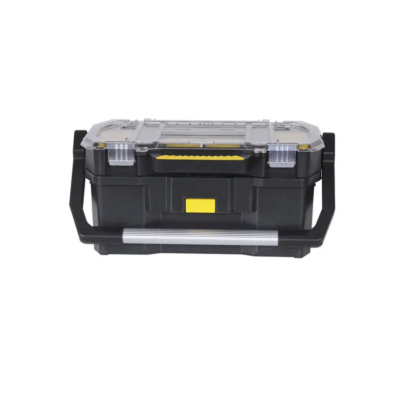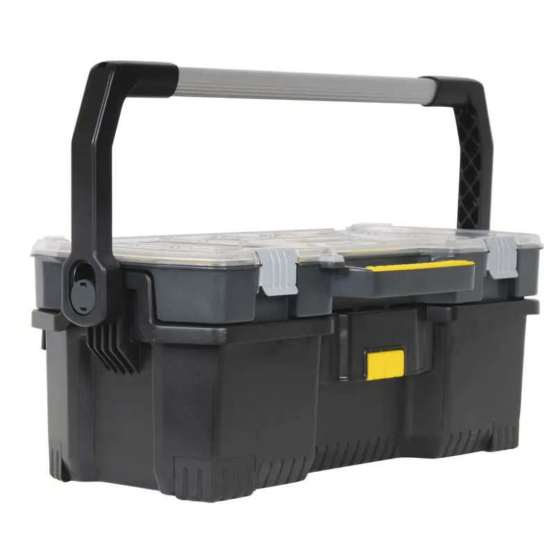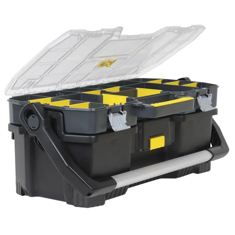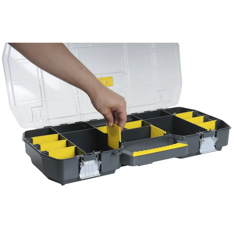 Ящик-органайзер инструментальный 55.6x32x24.9см STANLEY STST1-70317 Открытый ящик со съемным органайзером для электроинструмента и мелких деталейКнопка на передней поверхности для простого отсоединения органайзера от ящикаДля их соединения необходимо поместить органайзер задней частью на ящик и зафиксировать со щелчком, нажав сверху на переднюю частьДовга металева ручка скриньки, що фіксується у вертикальному положенні для перенесення, і що опускається вниз для зручності зберіганняМіцні металеві нержавіючі замки та металеві петлі біля верхнього кейсаОрганайзер має переставні перегородки для оптимізації структури під конкретні завданняУнікальна конфігурація відділень органайзера дозволяє розміщувати молотки та інші інструменти разом з дрібними деталямиВисокоміцна конструкція з структулена