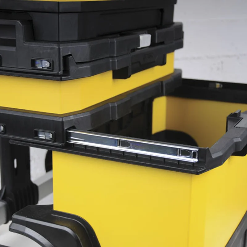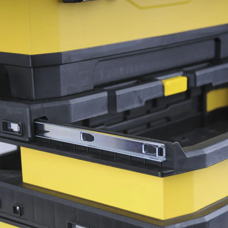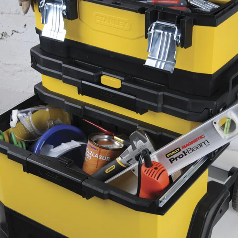 Ящик з колесами "Rolling Workshop" металопластиковий 73 x 56.8 x 38.9 STANLEY 1-95-621 Ящик з колесами "Stanley® Rolling Workshop" металлопластмассовый жовтий.Відокремлюваний металлопластмассовый ящик 20" для інструменту зі знімним лоткомВеликі металеві з захистом від корозії замки з можливістю використання навісного замка (в комплект поставки не входить)Висувна секція глибиною 10 см на підшипникахВелика нижня висувна секція має збільшений об'єм для зберігання і транспортування інструмента