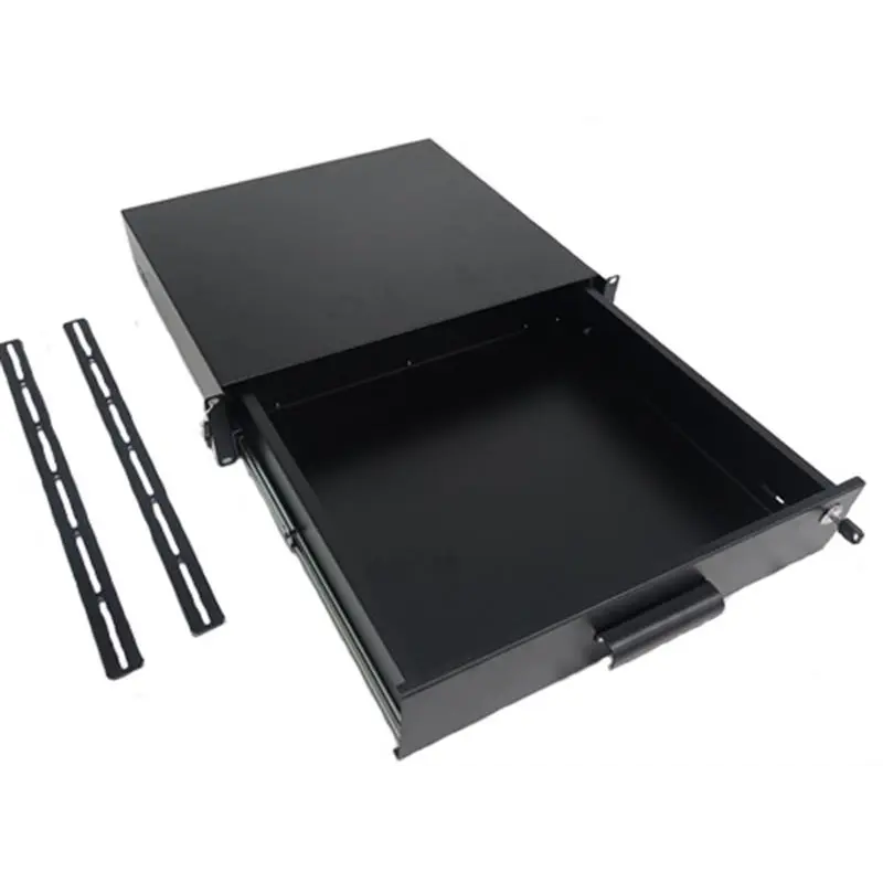 Зручний висувний ящик для зберігання різних речей: документації, інструкцій, аксесуарів, розхідних матеріалів та інших необхідних речей. Встановлюється в усі моделі 19" серверних стійок глибиною від 400мм. до 750 мм. Замикається на ключ. Для встановлення необхідно 8 комплектів кріплення.