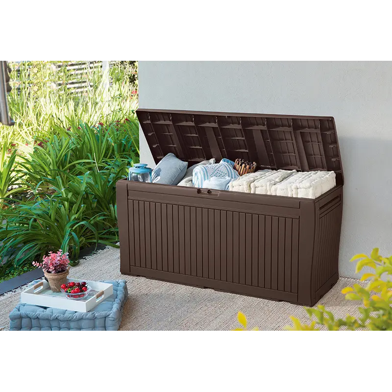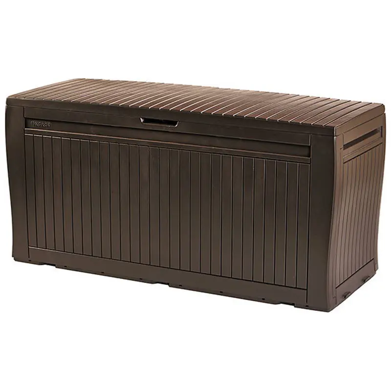 Ящик для зберігання Keter Comfy 270 л.Скриня пластикова, імітує деревину. Comfy Storage Box 270 – це стильне доповнення до комплектів садових меблів виробництва групи компаній KETER. Не має значення, що Ви зберігатимете в скрині: подушки від меблів, іграшки, садове приладдя або щось інше - вміст залишається сухим і добре вентилюватиметься. Крім того, скриня, що закривається, тому вміст буде в безпеці. Завдяки наявності коліс і ручок в корпусі, скриню можна перевозити в інше місце без особливих зусиль.Переваги:кільця для зручності перевезення;матеріал імітує деревину;ідеальний для вуличного зберігання і розрахований на будь-які погодні умови;не потребує фарбування, легко збирається;можливість закриття на замок (замок в комплект не входить)Матеріал: пластик, поліпропілен;Колір: коричневий;Бренд: Keter® (Ізраїль);Об'єм: 270 лРозміри: 117*45*57,5 смВага: 6,36 кгМакс. навантаження: 200 кг (на кришку)Розмір упаковки: 117*53*9 см