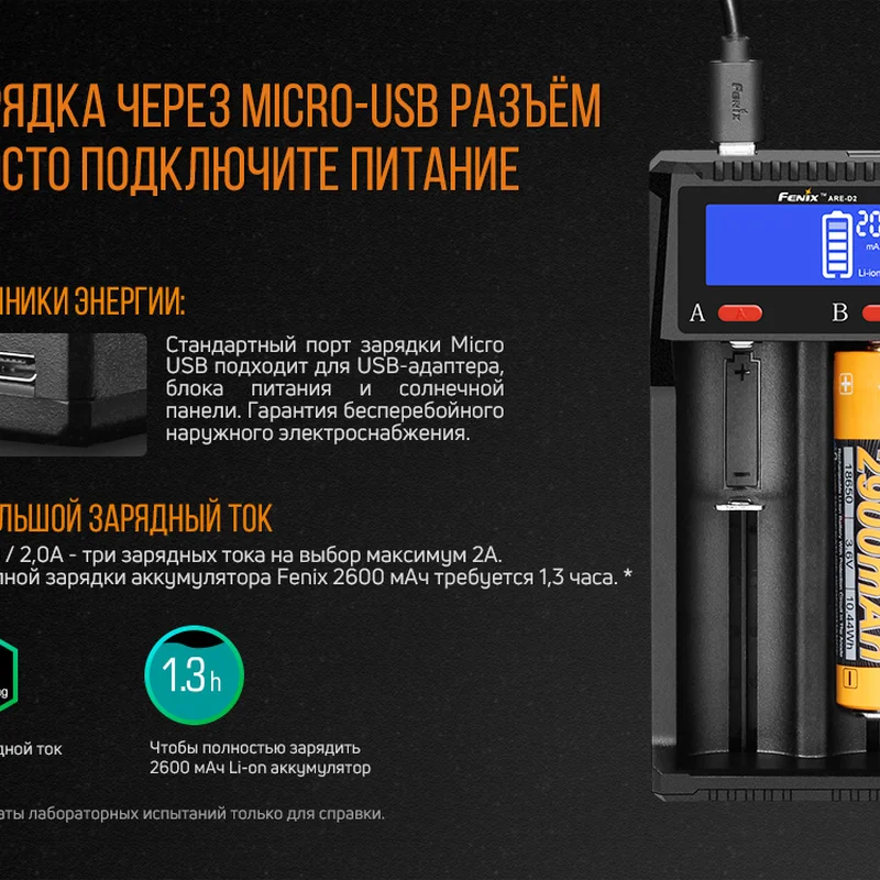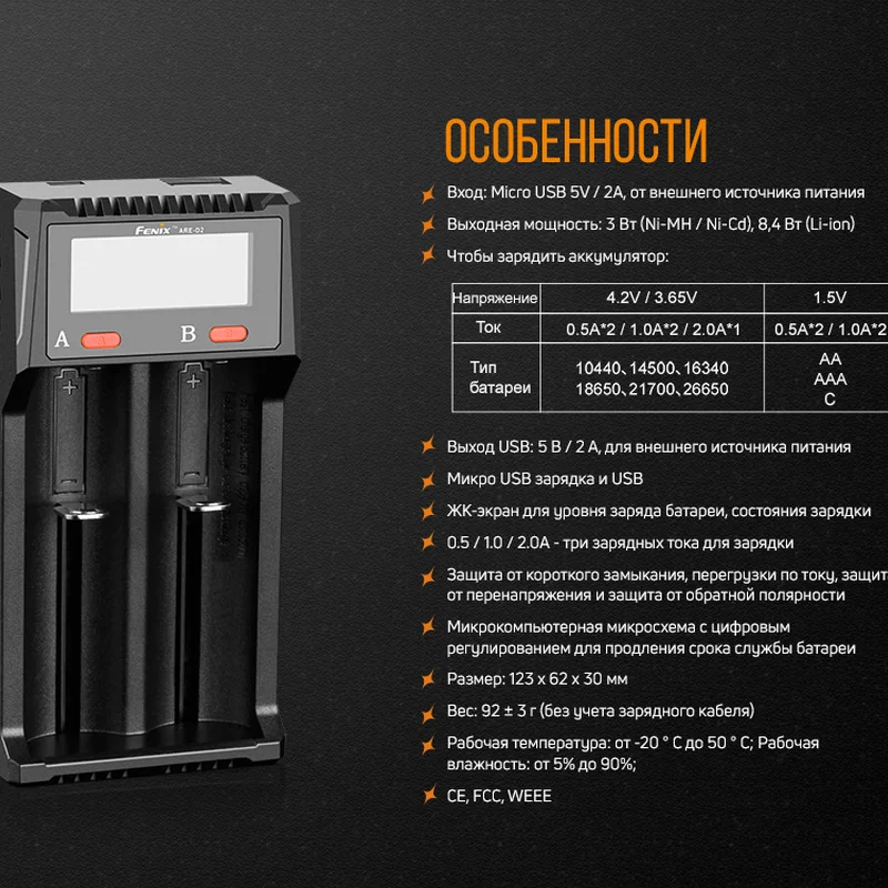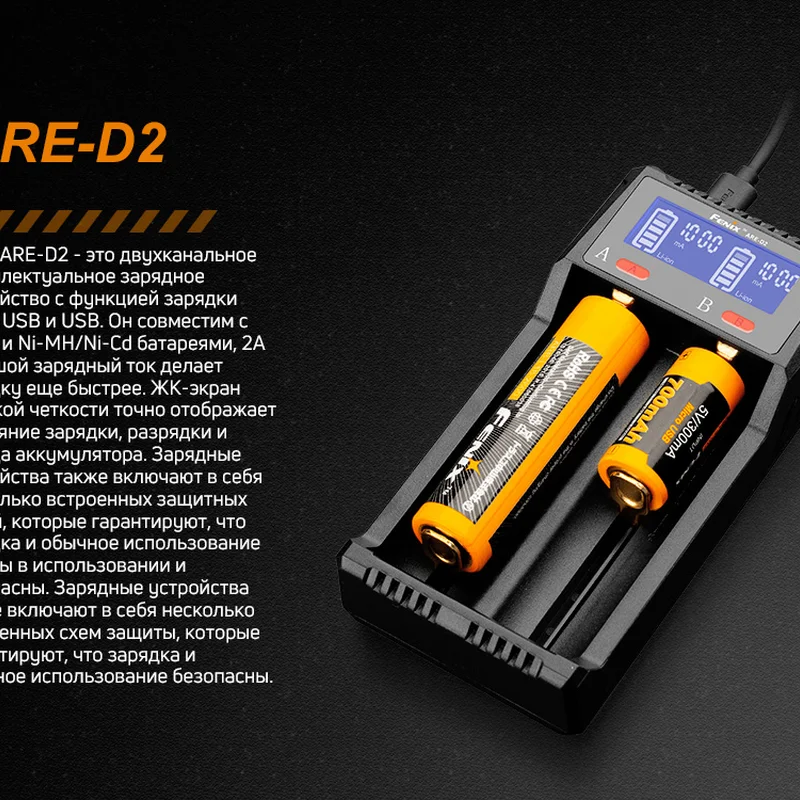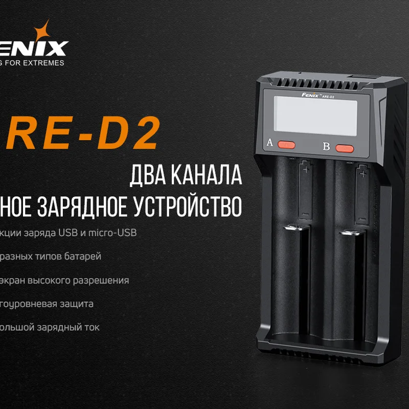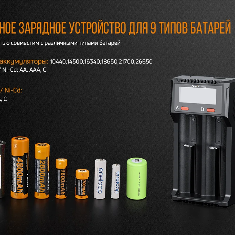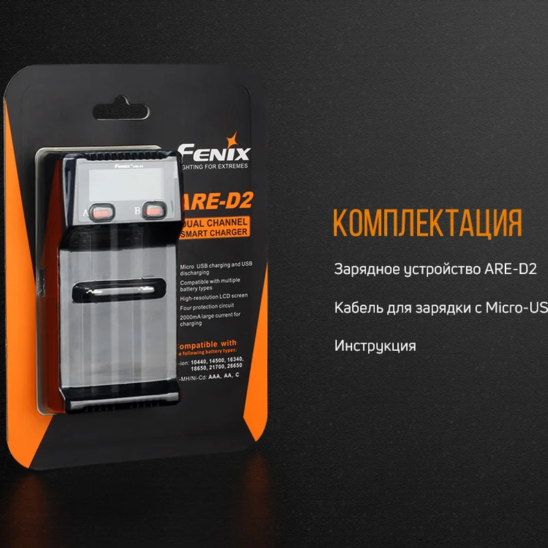 Модель Fenix ARE-D2 підійде тим покупцям, яким потрібно зарядний пристрій універсального типу. Воно в змозі працювати з елементами живлення 9 різних форматів. Це літій-іонні акумулятори 10440, 14500, 16340, 18650, 21700, 26650, нікель-металгідридні або менш розповсюджені нікель-кадмієві АА, ААА, С. Крім цього, виробники передбачили широкі можливості для підключення до джерела струму різного типу. В тому числі, пристрій сумісний з туристичними сонячними панелями.