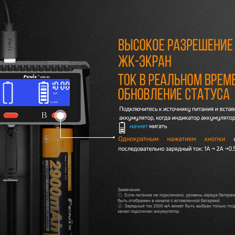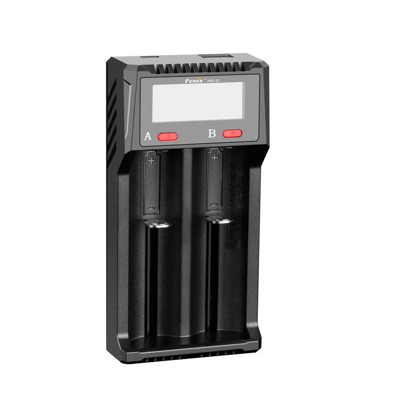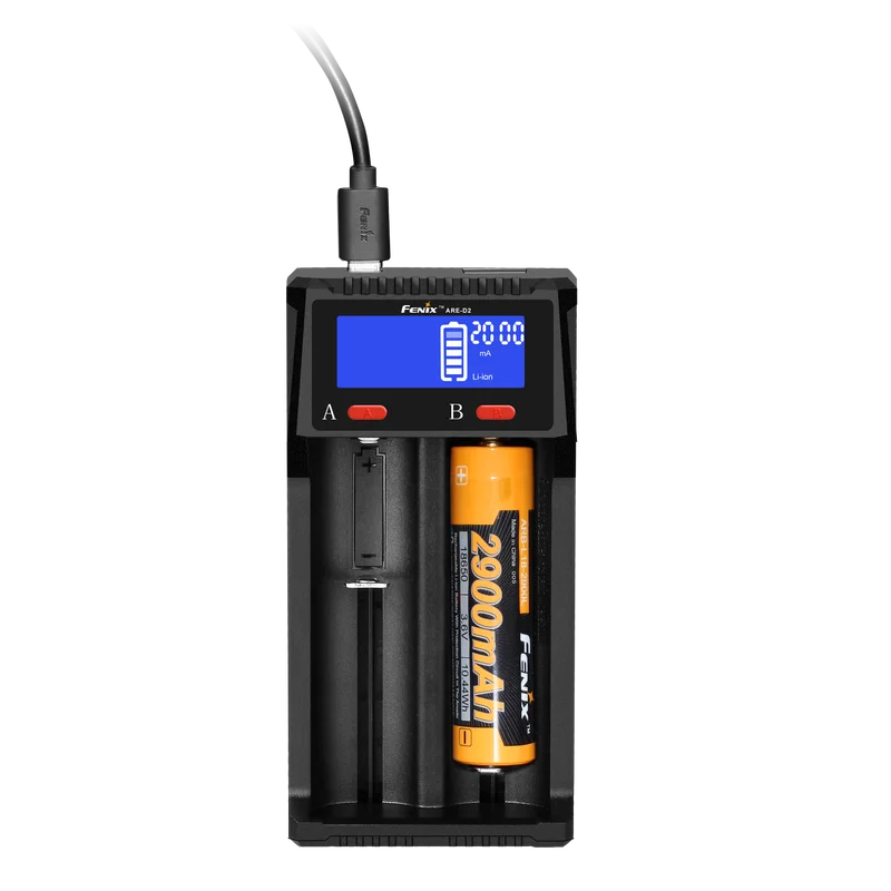 Щоб зарядити акумулятор, потрібно встановити його в слот для зарядного пристрою, а потім - підключити до мережі. Fenix ARE-D2 самостійно ідентифікує елемент живлення і обере для нього оптимальну програму. Тим не менш, у користувача зберігається можливість вручну вибрати потрібний варіант сили струму. Для акумуляторів з літієвим електролітом є 3 варіанти: 0,5 А, 1А, 2А. Для елементів живлення на основі нікелю варіантів 2: 0,5 А і 1А. Функція вибору сили струму буде доступною протягом 8 секунд після включення Fenix ARE-D2.