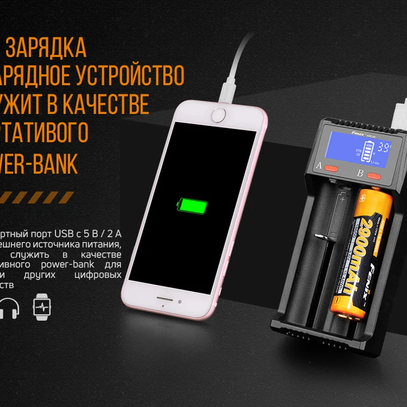 Для моделі Fenix ARE-D2 також передбачена функція розрядки в режимі Power-банк. Вона працює тільки з акумуляторами літій-іонного типу будь-якого з доступних форматів. З допомогою цієї функції навіть в похідних умовах можна зарядити смартфон, GPS-трекер або інше обладнання. Функція зарядки акумулятора в цей час буде недоступною.