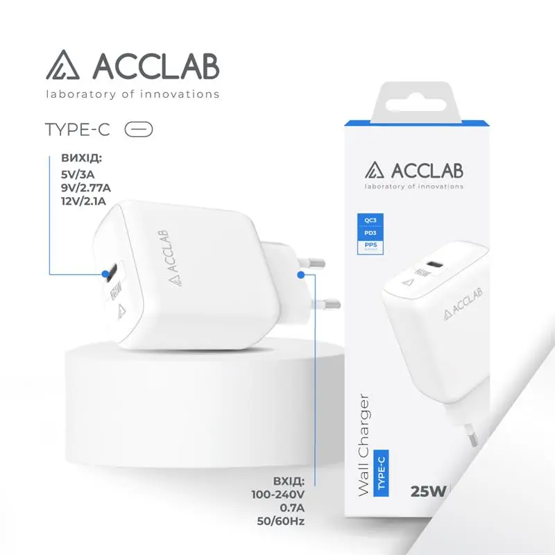 Зарядний пристрій AccLab AL-TC125 1хType-C 5В/3A/25W QC/PD 3.0 White (1283126538841)