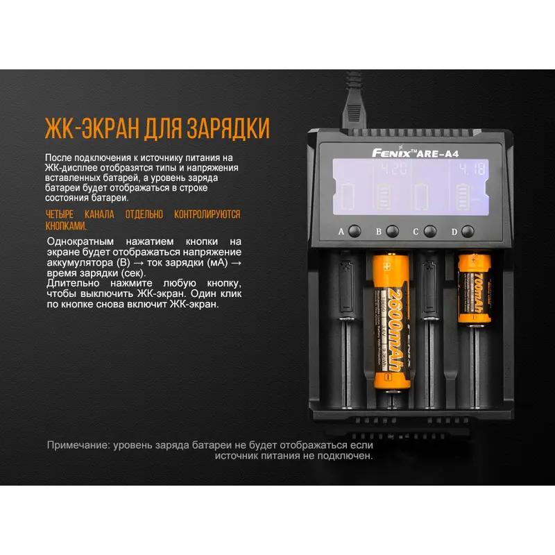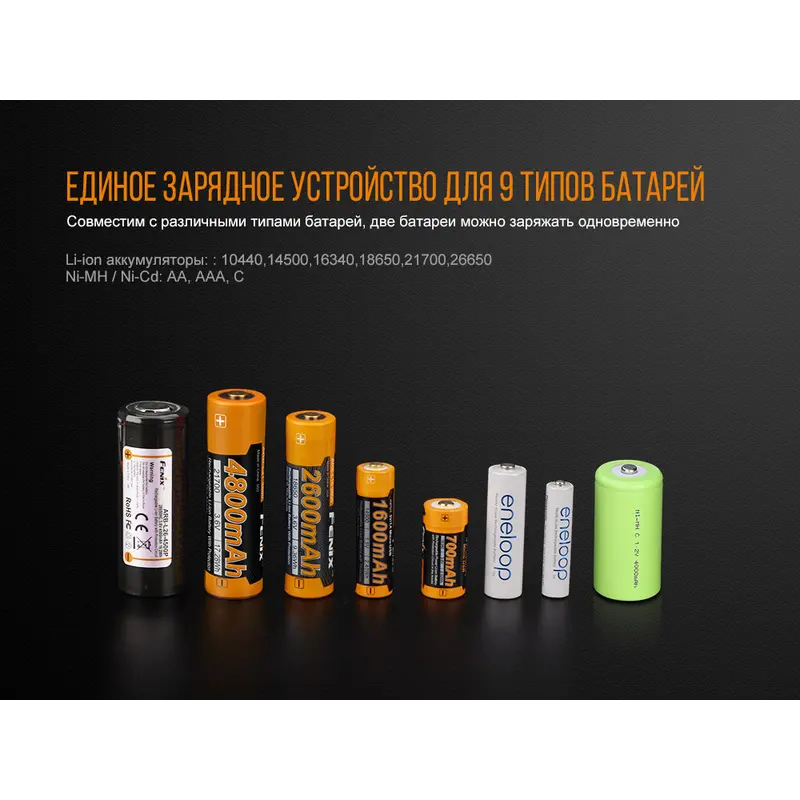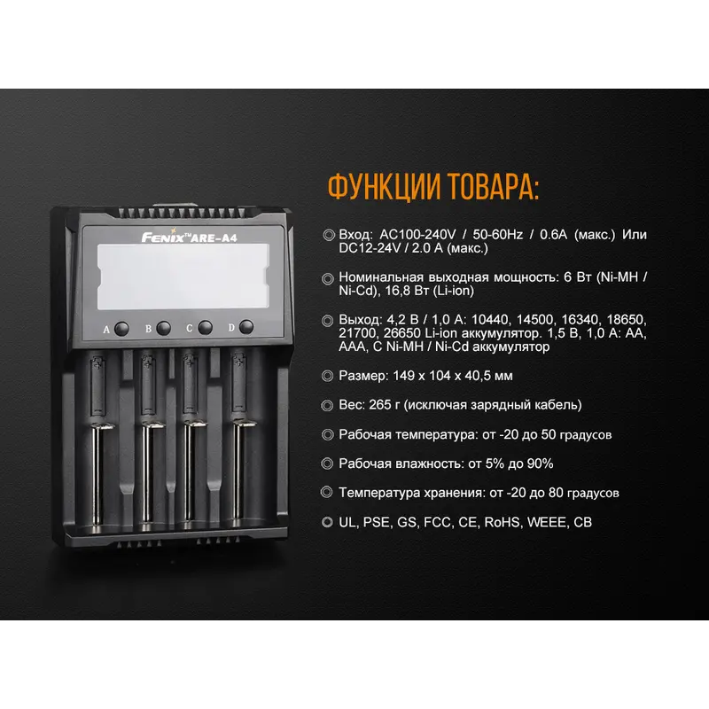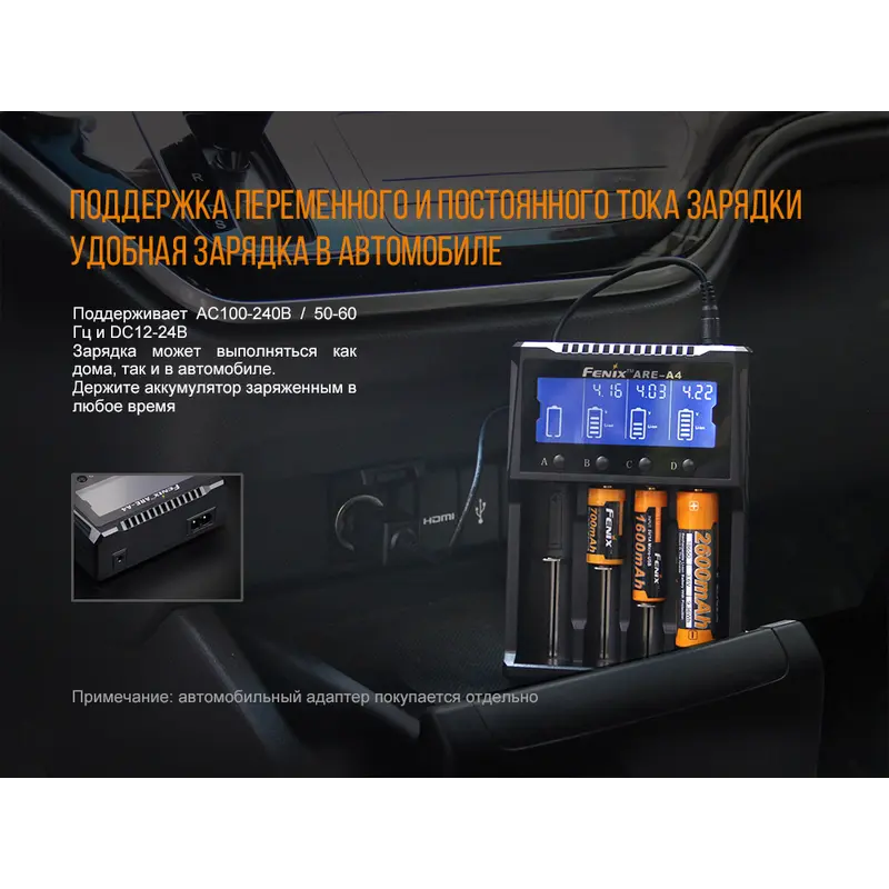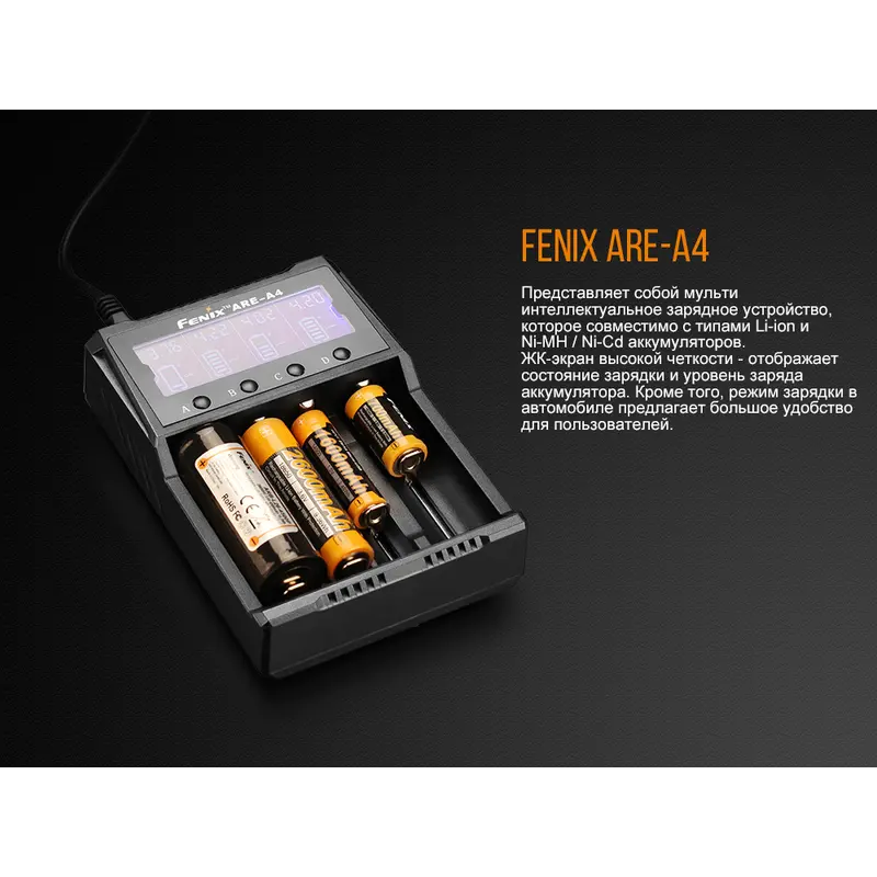 Fenix ARE-A4 являє собою дійсно універсальний зарядний пристрій, який може працювати практично де завгодно і майже з будь-якими видами акумуляторів. Для нього допустима установка елементів живлення 9 різних форматів. Це 6 різновидів літій-іонних елементів живлення (18650, 14500, 26650, 10440, 21700, 16340) і ще 3 типу нікель-кадмієвих або нікель-металгідридних (АА, ААА, С). Прямо з коробки пристрій готовий до підключення до центральної електромережі. А щоб використовувати його в автомобілі, потрібно придбати окремий кабель. При його наявності, Fenix ARE-A4 підходить для будь-яких автоподорожей. До того ж, вага даної моделі дорівнює всього 265 м, що робить її відмінним варіантом спорядження для мандрівників.