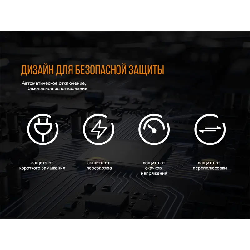 Виробники подбали про довговічності зарядного пристрою Fenix ARE-A4, забезпечивши його кількома захисними системами. Для цієї моделі не страшні короткі замикання, встановлення акумуляторів в неправильному положенні, нагрівання елементів живлення і їх надмірна зарядка. Також зарядний пристрій не вимогливо до параметрів навколишнього середовища. Під час його роботи температури навколо може бути від 20градусов мороза, до 50 градусів спеки. Вологість може складати від 5% до 90%.