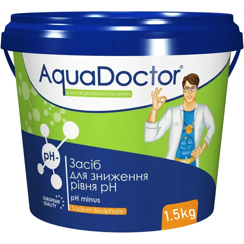 Швидкорозчинний препарат AquaDoctor pH- (Minus) призначений для корекції (зниження) кислотно-лужного балансу води в басейні до нормованого рівня (7.2-7.4). Вода з оптимальним рівнем pH, збільшує ефективність дезинфікуючих засобів і коагулянтів, а також запобігає подразненню слизових оболонок людини і утворенню вапняних відкладень на дні та стінках басейну. На основі natriumhydrogensulfat (NaHSO₄ гідросульфат натрію).