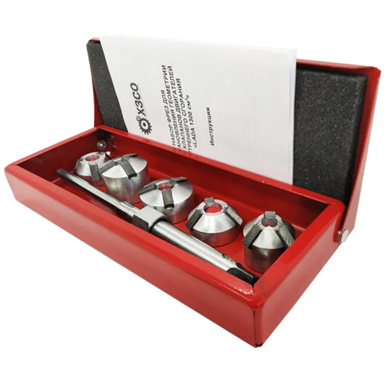 Набір фрез для відновлення геометрії сідел клапанів двс "LADA 1300см3" Набір фрез (шарошок) LADA 1300 см3 ВАЗ призначений для відновлення геометрії сідел клапанів двигунів внутрішнього згоряння автомобілів.Ці фрези мають у своїй конструкції різальні ножі з фіксованим положенням, тобто нерегульовані положення щодо корпусу фрези.Конструкція та розміри фрез дають змогу обробляти сідла клапанів, забезпечуючи значення кутів і діаметрів відповідно до рекомендацій заводу виробника двигуна.Український виробник ХЗСО набору фрез гарантує, що за дотримання всіх умов інструкції різальний інструмент слугуватиме тривалий термін і принесе максимальний прибуток.Комплектність набору фрез:Набір складається з різального інструменту — фрез (шарошок), з різними діаметрами та кутами, а також напрямного стрижня (пілота).Набір фрез дає змогу обробляти фаски сідел клапанів, двигунів автомобілів сімейства LADA з об'ємом 1300 см3, забезпечуючи такі кути, рекомендовані заводом виробником: A 45o, B 30o, C 20o.Фрези 45 В, 45С дають змогу обробити сідла клапанів, забезпечуючи кут фаски А 45o.Фрези 20A, 20 В дають змогу обробити сідла клапанів, забезпечуючи кут фаски 20o.Фреза 60Е дає змогу обробити сідла клапанів, забезпечуючи кут фаски B 30o. Характеристики:Діапазон оброблюваних діаметрів виріб клапанів, мм:17,6-32,6; 21,5-36,5; 15,8-36,4; 12,7-33,2; 24,6-34,6Кути фрез, o:60º; 90º; 140ºДіаметр напрямного стрижня (пілота), мм:8Ширина робочої фаски сідла клапана, мм:впускного 1,9-2 і випускного 1,6-1,7 Комплектація:Фреза 20A 140º Фреза 20B 140º Фреза 60Е 60º Фреза 45B 90º Фреза 45C 90º Напрямний стрижень (пілот) діаметром 8 мм із гайкою