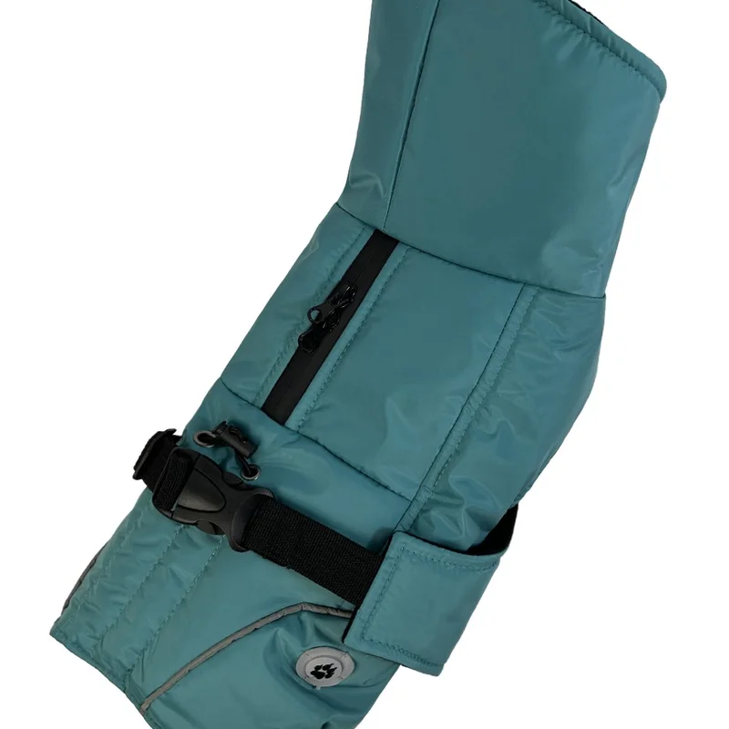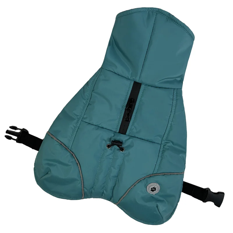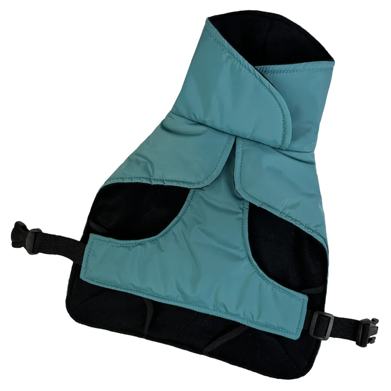 тканина водовідштовхувальна плащівка наповнювач синтепон флісовий підклад застібається поясом на спинці регулятор обхвату грудей регулятор довжини спинки на спинці отвір з близкавкою для повідка від шлейки резиночки для фіксації жилета на задніх лапах високий комірець, який закриває вушка (можна підвернути) модель унісекс