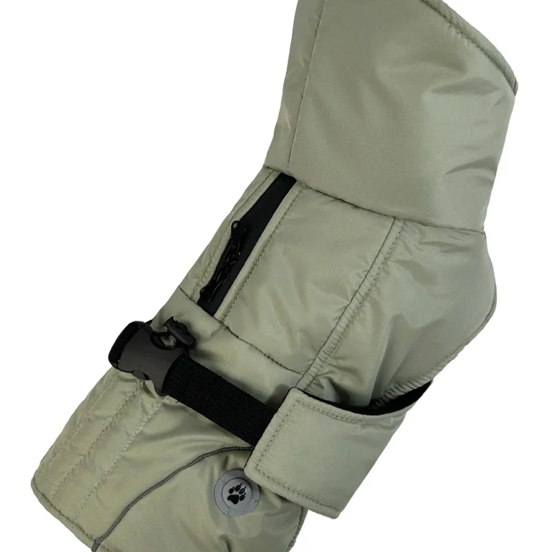 тканина водовідштовхувальна плащівка наповнювач синтепон флісовий підклад застібається поясом на спинці регулятор обхвату грудей регулятор довжини спинки на спинці отвір з близкавкою для повідка від шлейки резиночки для фіксації жилета на задніх лапах високий комірець, який закриває вушка (можна підвернути) модель унісекс