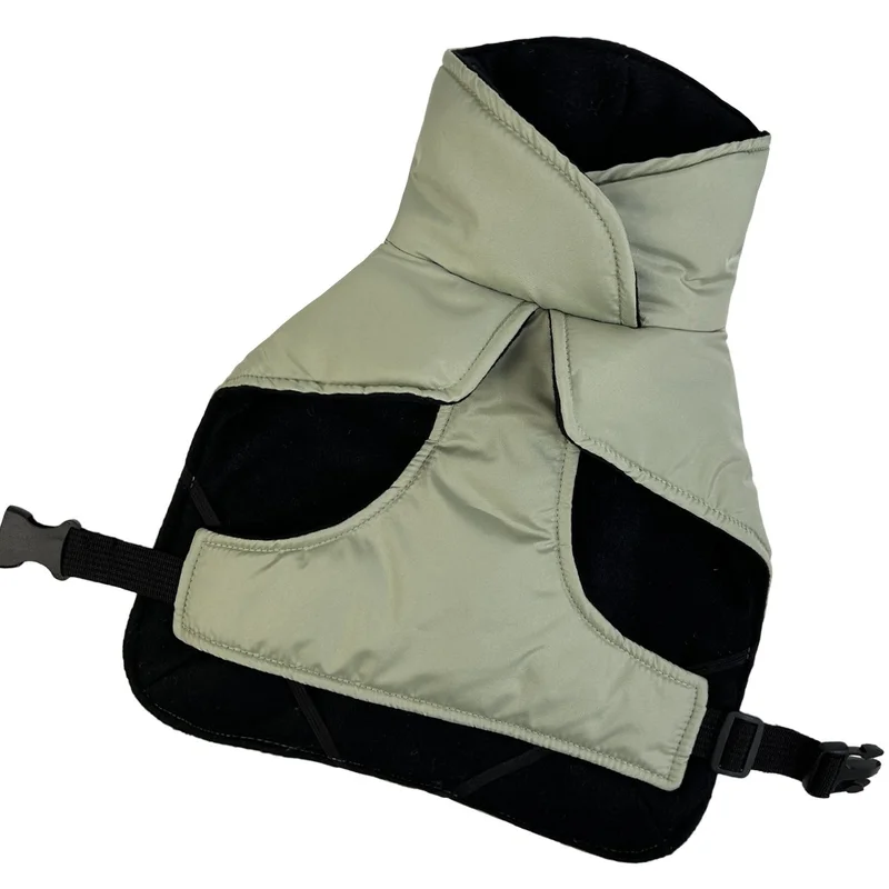 тканина водовідштовхувальна плащівка наповнювач синтепон флісовий підклад застібається поясом на спинці регулятор обхвату грудей регулятор довжини спинки на спинці отвір з близкавкою для повідка від шлейки резиночки для фіксації жилета на задніх лапах високий комірець, який закриває вушка (можна підвернути) модель унісекс