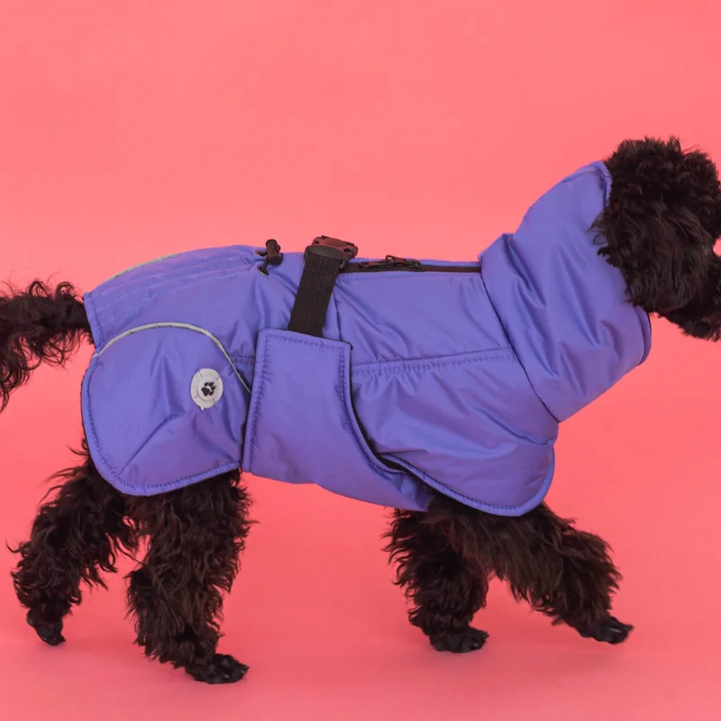 тканина водовідштовхувальна плащівка наповнювач синтепон флісовий підклад застібається поясом на спинці регулятор обхвату грудей регулятор довжини спинки на спинці отвір з близкавкою для повідка від шлейки резиночки для фіксації жилета на задніх лапах високий комірець, який закриває вушка (можна підвернути) модель унісекс