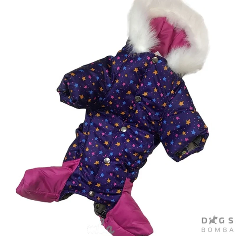 тканина водовідштовхувальна плащівка; наповнювач синтепон; підкладка нейлон; капюшон з кнопкою фіксатором; опушка штучний хутро; модель для дівчинки: живіт ЗАКРИТИЙ; на шиї проріз для повідця; застібається кнопками на животі.