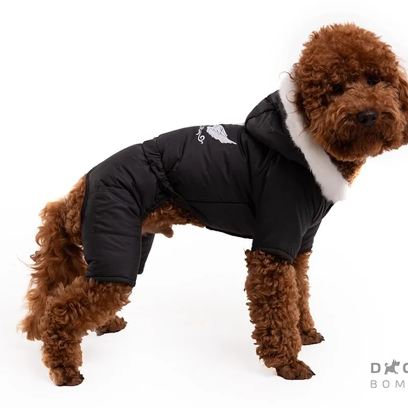 тканина водовідштовхувальна плащівка; наповнювач синтепон; підкладка нейлон; капюшон з кнопкою фіксатором; опушка штучне хутро; на спині текстильна накатка; на шиї проріз для повідця; застібається кнопками на животі модель унісекс.