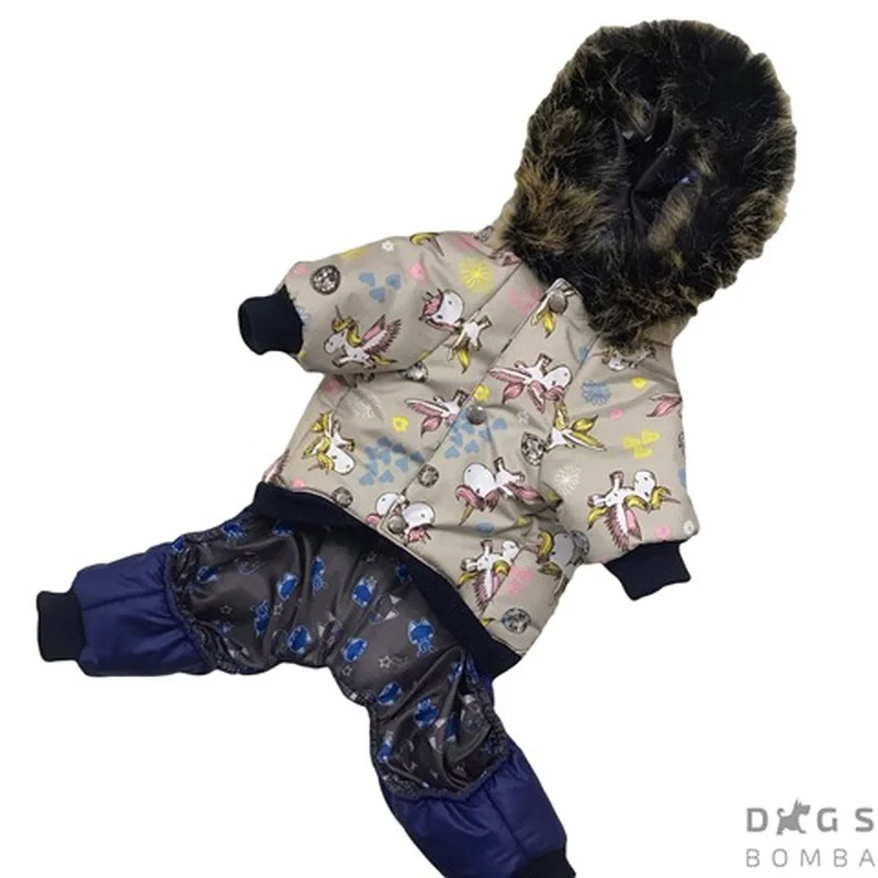 тканина водовідштовхувальна плащівка; наповнювач синтепон; підкладка нейлон; капюшон з кнопкою фіксатором; опушка штучне хутро; рукава, штани, пояс довяз; на шиї проріз для повідця; застібається кнопками на животі модель унісекс.