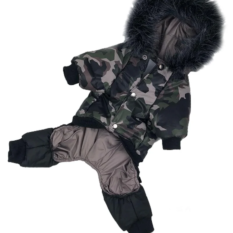 тканина водовідштовхувальна плащівка; наповнювач синтепон; підкладка нейлон; капюшон з кнопкою фіксатором; опушка штучний хутро; рукава, штани, пояс довяз; на шиї проріз для повідця; застібається кнопками на животі модель унісекс.