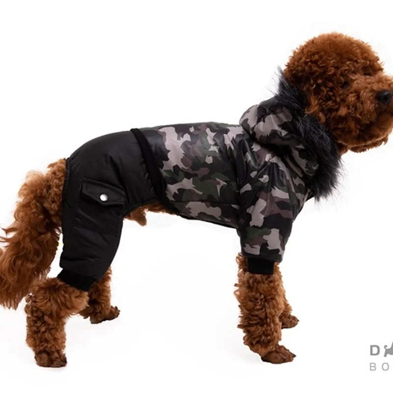тканина водовідштовхувальна плащівка; наповнювач синтепон; підкладка нейлон; капюшон з кнопкою фіксатором; опушка штучний хутро; рукава, штани, пояс довяз; на шиї проріз для повідця; застібається кнопками на животі модель унісекс.