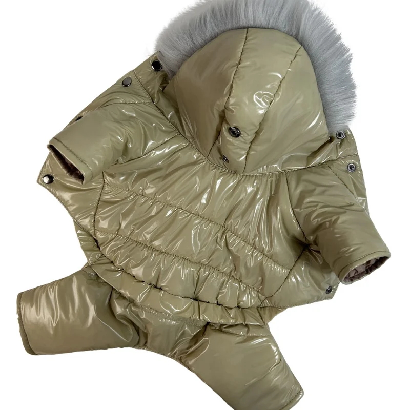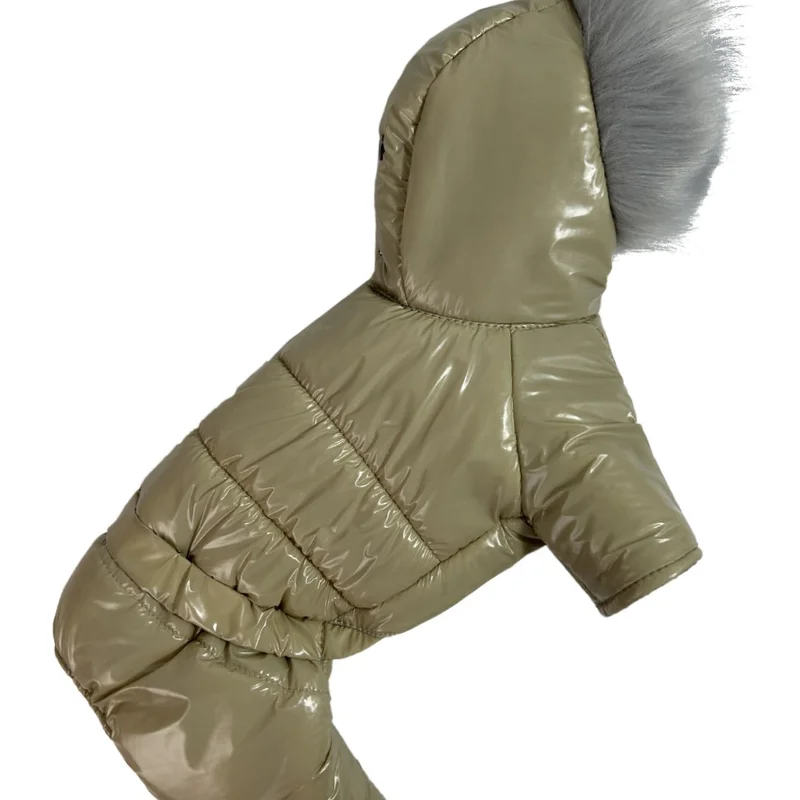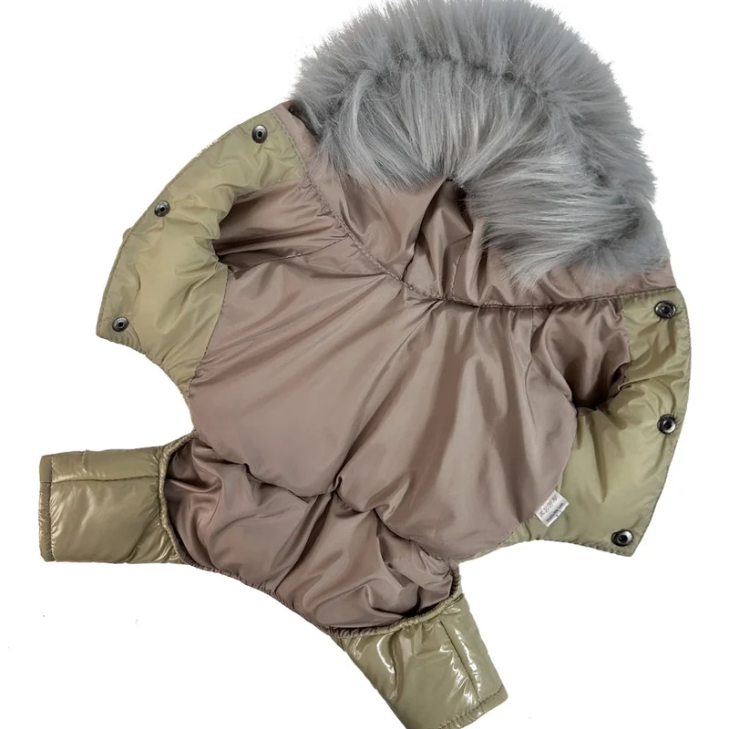 тканина водовідштовхувальна плащівка наповнювач синтепон підкладка нейлон капюшон з кнопкою фіксатором опушка штучне хутро рукава, штани, пояс з резинкою на шиї проріз для повідця застібається кнопками на животі модель унісекс