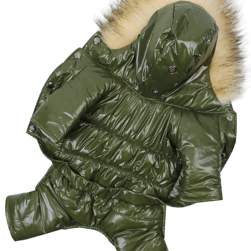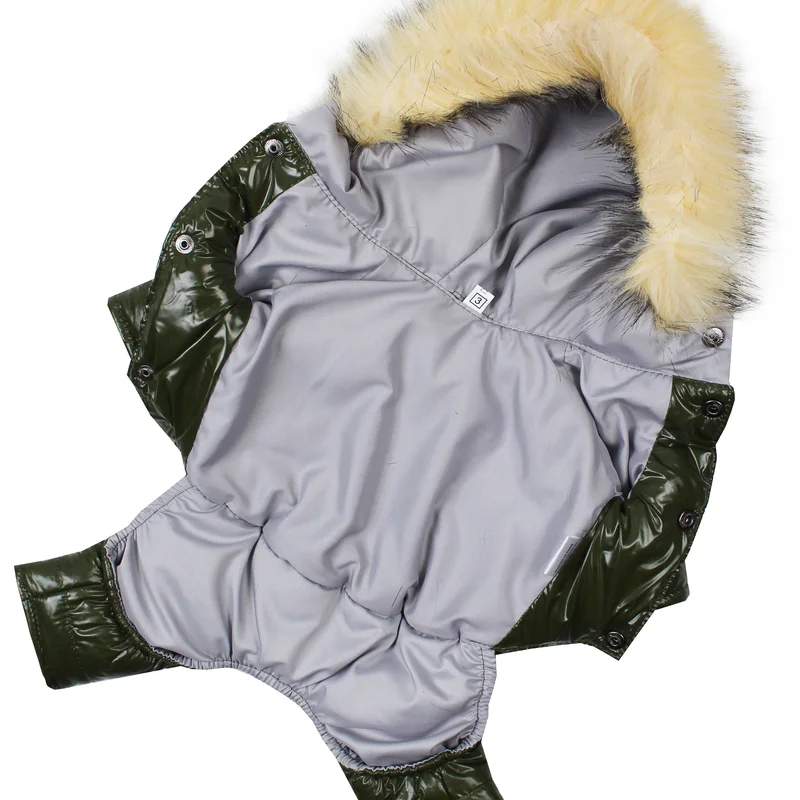 тканина водовідштовхувальна плащівка наповнювач синтепон підкладка нейлон капюшон з кнопкою фіксатором опушка штучне хутро рукава, штани, пояс з резинкою на шиї проріз для повідця застібається кнопками на животі модель унісекс