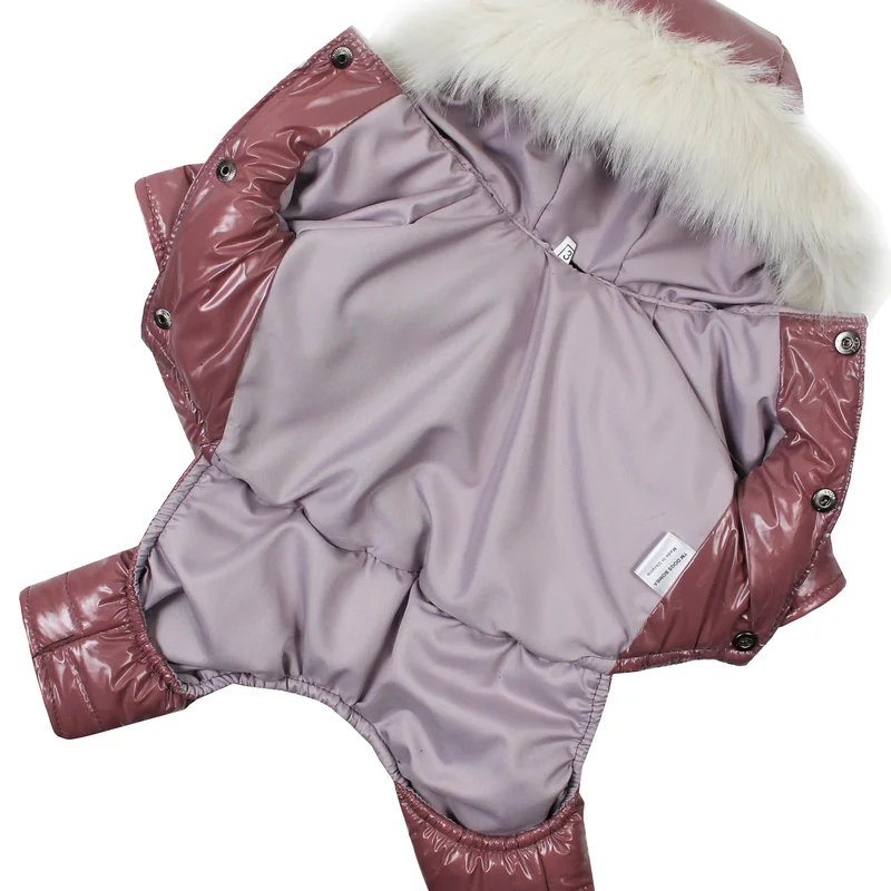 тканина водовідштовхувальна плащівка наповнювач синтепон підкладка нейлон капюшон з кнопкою фіксатором опушка штучне хутро рукава, штани, пояс з резинкою на шиї проріз для повідця застібається кнопками на животі модель унісекс