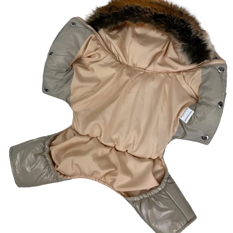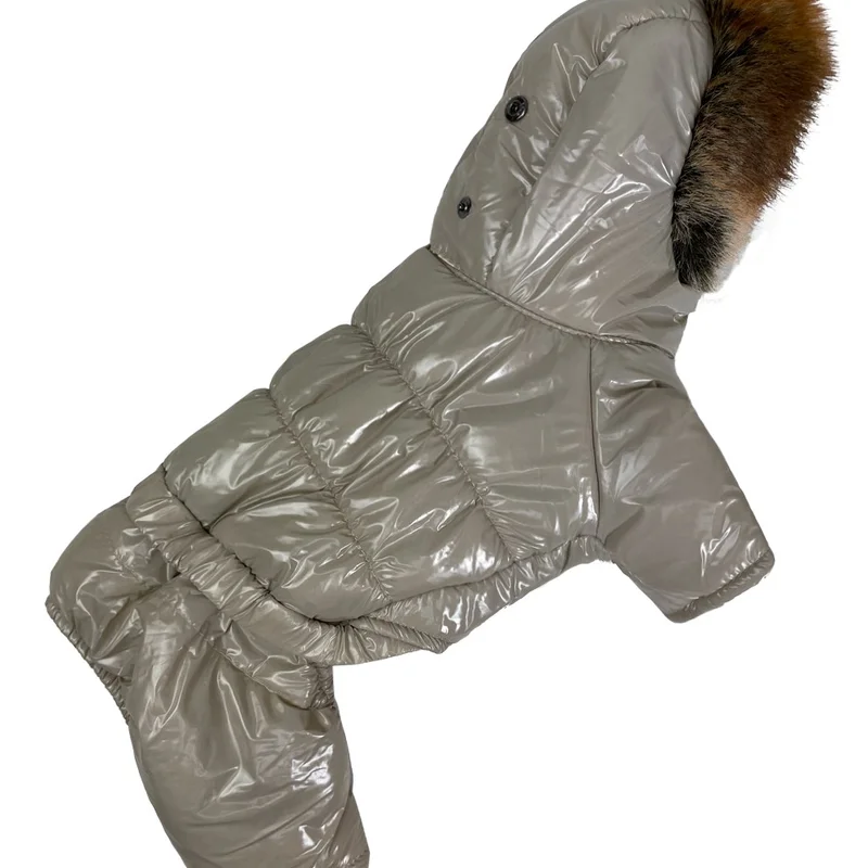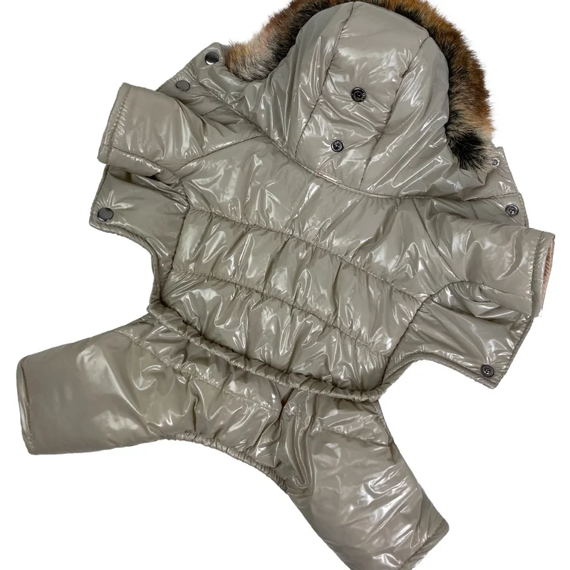 тканина водовідштовхувальна плащівка наповнювач синтепон підкладка нейлон капюшон з кнопкою фіксатором опушка штучне хутро рукава, штани, пояс з резинкою на шиї проріз для повідця застібається кнопками на животі модель унісекс