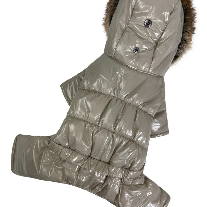 тканина водовідштовхувальна плащівка наповнювач синтепон підкладка нейлон капюшон з кнопкою фіксатором опушка штучне хутро рукава, штани, пояс з резинкою на шиї проріз для повідця застібається кнопками на животі модель унісекс