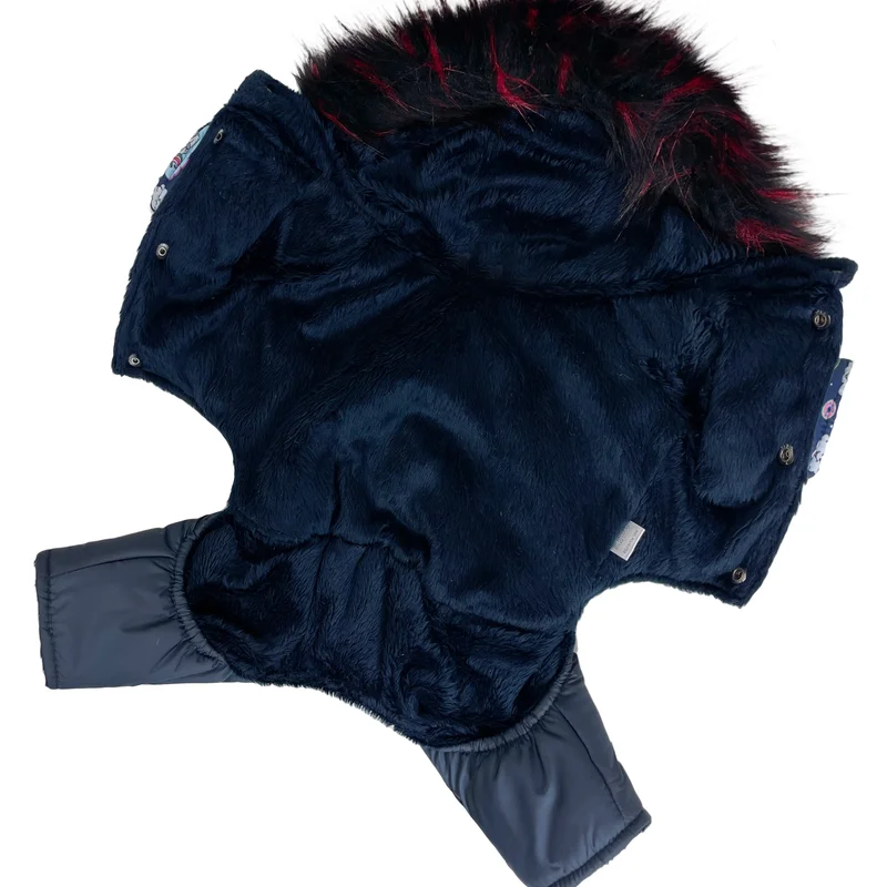тканина водовідштовхувальна плащівка наповнювач синтепон підклад з плюшевого хутра комір-стійка для захисту шиї від холоду капюшон з кнопкою фіксатором на шиї є отвір для повідця застібається кнопками на животі на комірі може бути 1 або 2 кнопки, в залежності від розміру модель унісекс