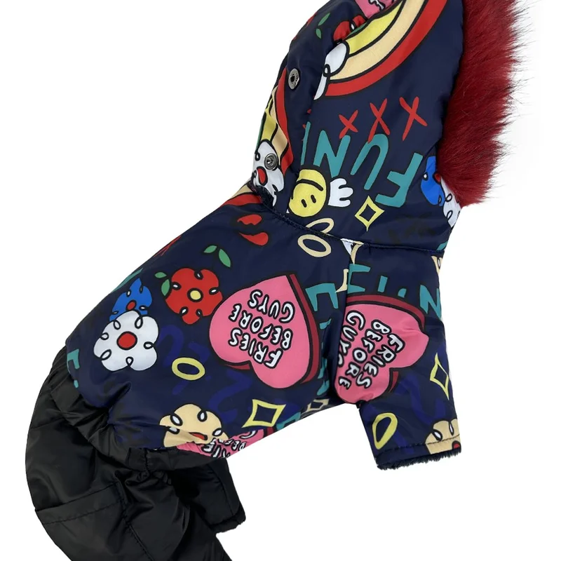 тканина водовідштовхувальна плащівка наповнювач синтепон підклад з плюшевого хутра комір-стійка для захисту шиї від холоду капюшон з кнопкою фіксатором на шиї є отвір для повідця застібається кнопками на животі на комірі може бути 1 або 2 кнопки, в залежності від розміру модель унісекс