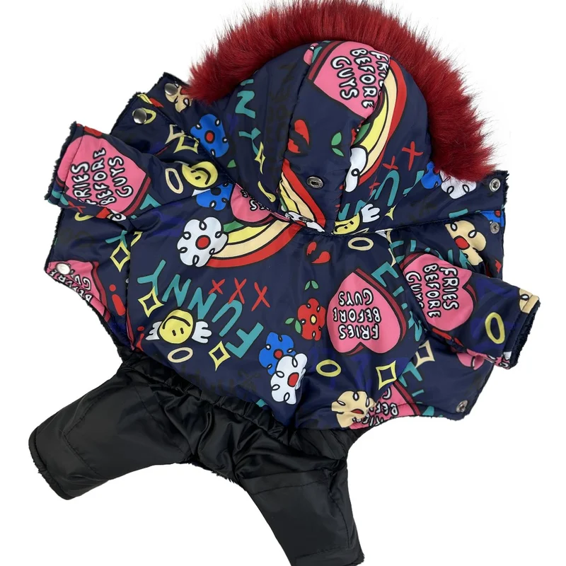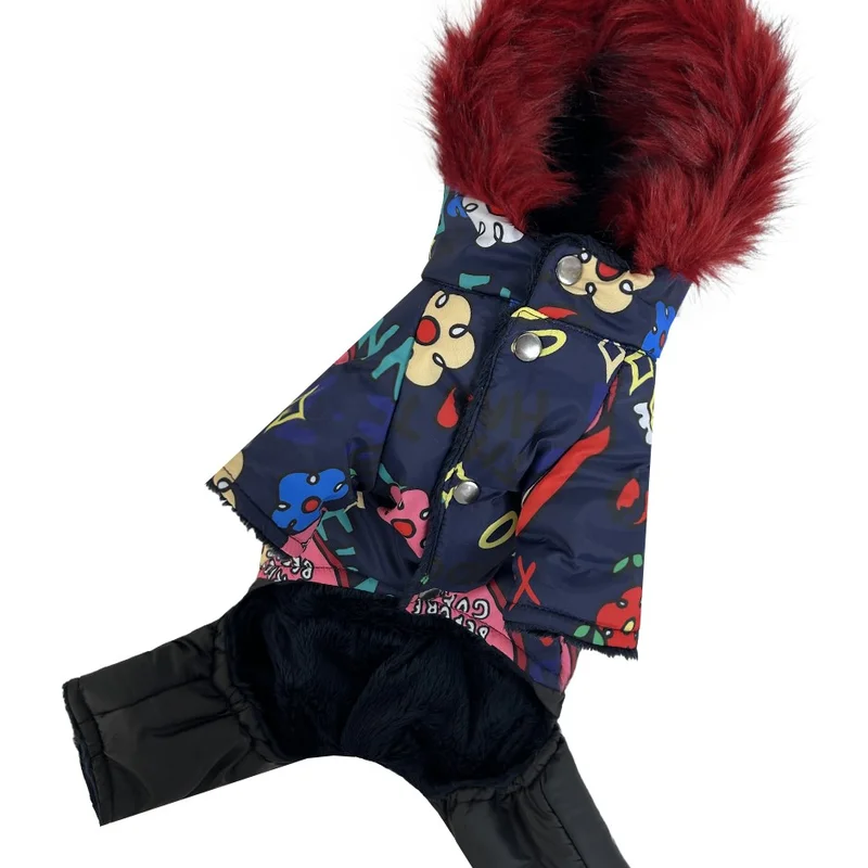 тканина водовідштовхувальна плащівка наповнювач синтепон підклад з плюшевого хутра комір-стійка для захисту шиї від холоду капюшон з кнопкою фіксатором на шиї є отвір для повідця застібається кнопками на животі на комірі може бути 1 або 2 кнопки, в залежності від розміру модель унісекс