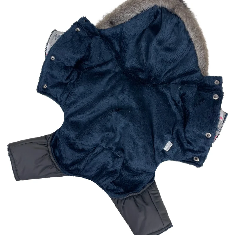 тканина водовідштовхувальна плащівка наповнювач синтепон підклад з плюшевого хутра комір-стійка для захисту шиї від холоду капюшон з кнопкою фіксатором на шиї є отвір для повідця застібається кнопками на животі на комірі може бути 1 або 2 кнопки, в залежності від розміру модель унісекс