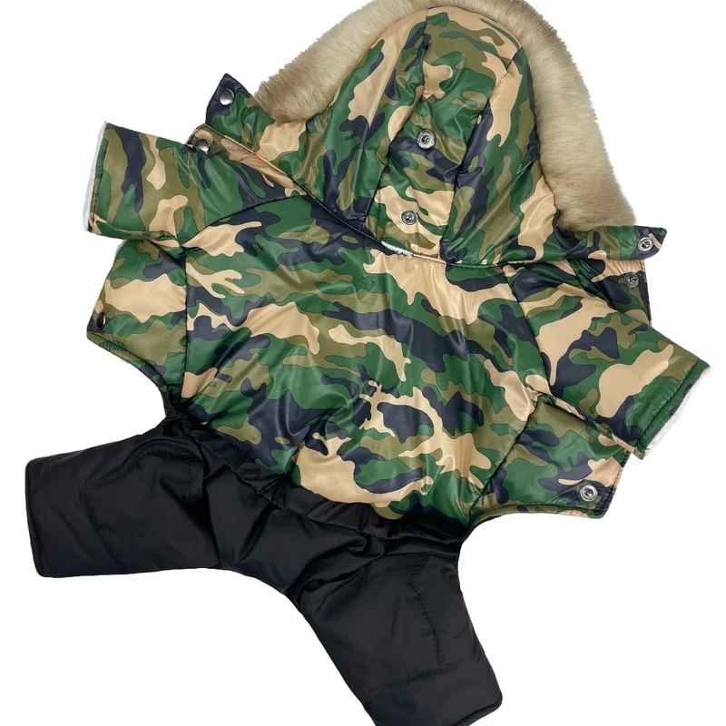 тканина водовідштовхувальна плащівка наповнювач синтепон підклад з плюшевого хутра комір-стійка для захисту шиї від холоду капюшон з кнопкою фіксатором на шиї є отвір для повідця застібається кнопками на животі на комірі може бути 1 або 2 кнопки, в залежності від розміру модель унісекс