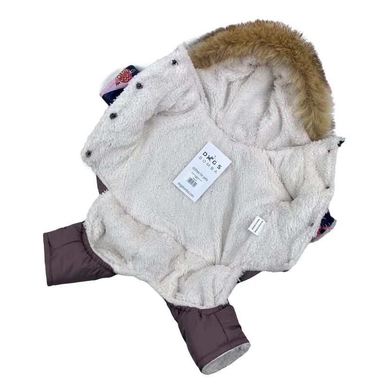 тканина водовідштовхувальна плащівка наповнювач синтепон підклад з плюшевого хутра комір-стійка для захисту шиї від холоду капюшон з кнопкою фіксатором на шиї є отвір для повідця застібається кнопками на животі на комірі може бути 1 або 2 кнопки, в залежності від розміру модель унісекс