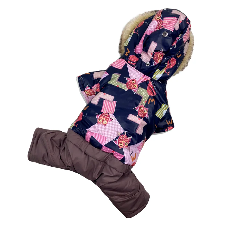 тканина водовідштовхувальна плащівка наповнювач синтепон підклад з плюшевого хутра комір-стійка для захисту шиї від холоду капюшон з кнопкою фіксатором на шиї є отвір для повідця застібається кнопками на животі на комірі може бути 1 або 2 кнопки, в залежності від розміру модель унісекс