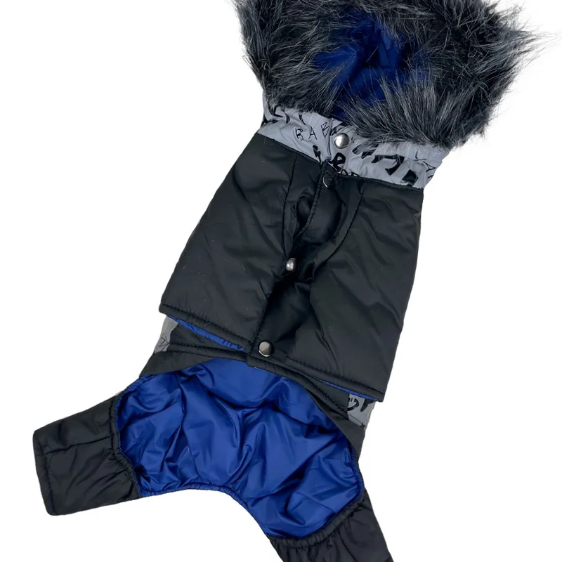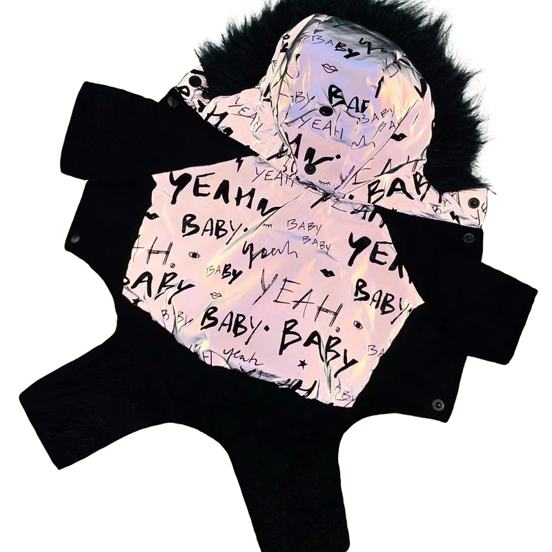 тканина світловідбиваюча плащівка комбінезон світиться при направленні на нього будь-якого світла перше фото в темряві, при направленні світла на комбінезон кращий вибір для безпечних прогулянок ввечері, собаку видно на дорозі наповнювач синтепон (200 г / м²) підклад з водооталкивающая плащової тканини на шиї отвір для повідця капюшон з кнопкою фіксатором комірець стійка застібається кнопками на животі модель унісекс