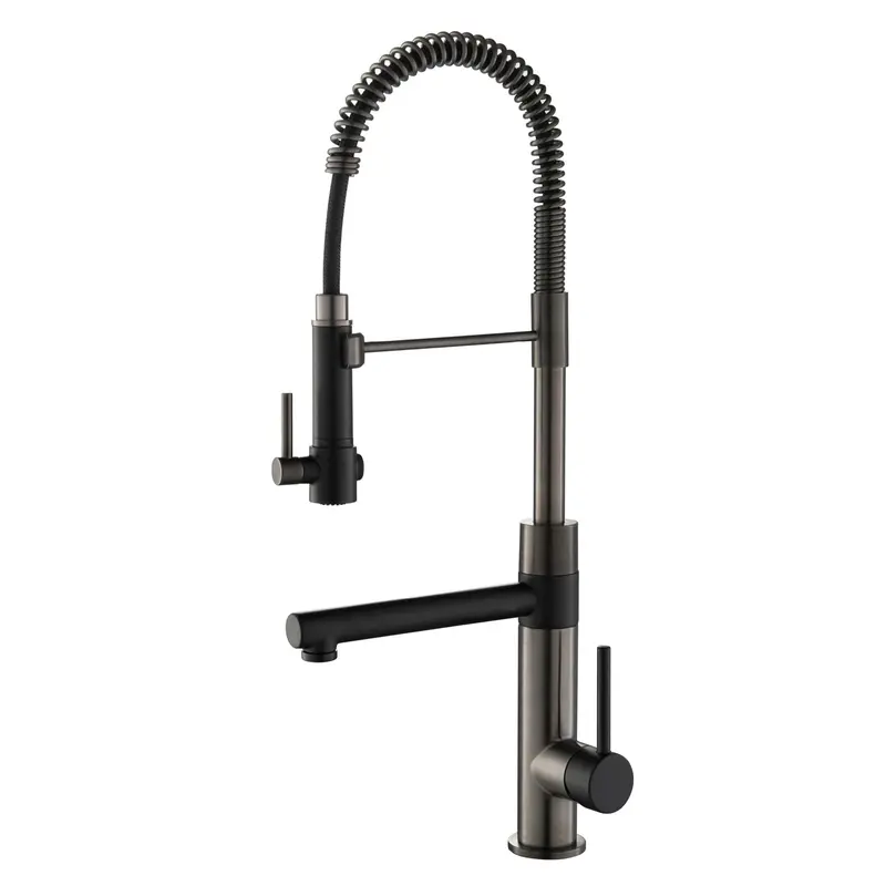 - верхній кран - високий пружинний вилив з лійкою-спреєм для попереднього ополіскування і видалення твердих залишків їжі;