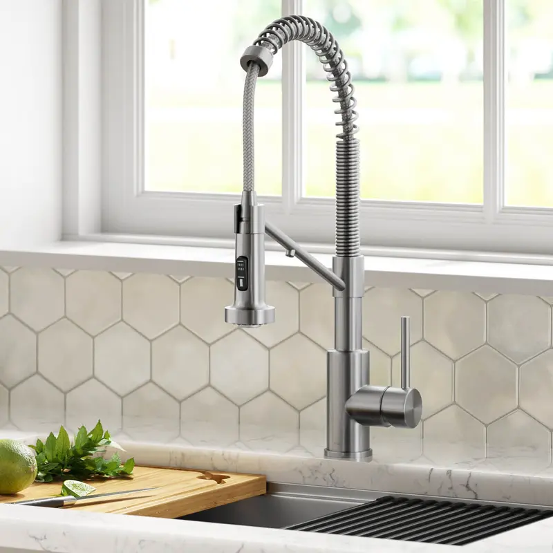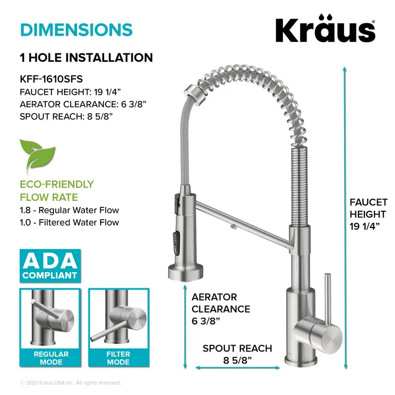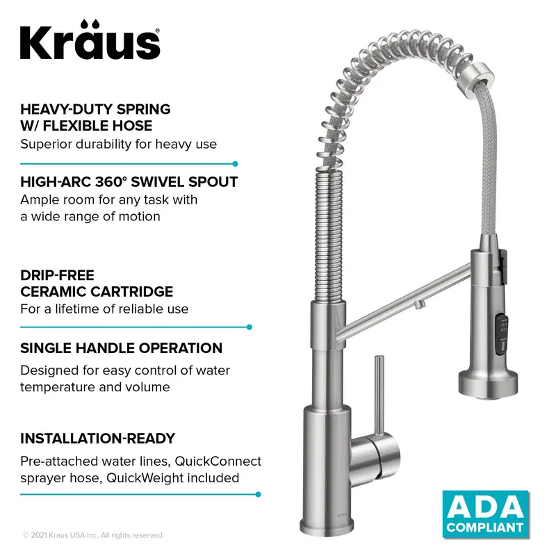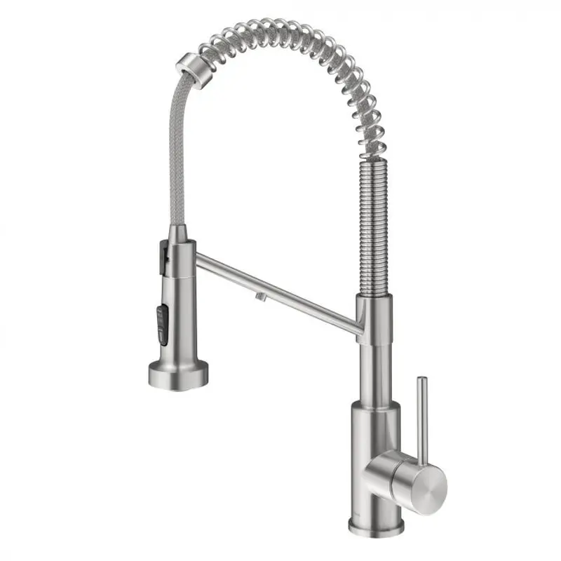 з відкритою спіраллю і має перевагу компактної висоти, яка підходить там, де інші змішувачі комерційного типу не поміщаються. Висувною виливши з поворотним адаптером забезпечує чудову маневреність і розширений діапазон руху, дозволяючи вам дотягнутися до всього навколо кухонного миття.