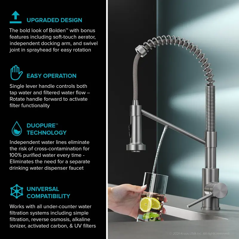 Конструкція 2-в-1 усуває необхідність в окремій системі очищення води або громіздкому фільтрі, монтується на кран, покращуючи зовнішній вигляд і функціональність вашої кухні. Створений за технологією DuoPure ™, цей інноваційний