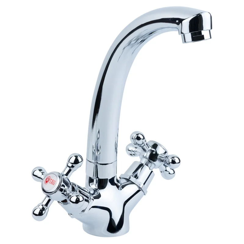 Двохвентильний змішувач для кухні VD-5B361C має вигнутий поворотний вилив висотою 200 мм і вбудований аератор. Виріб покрито хромонікелевим напиленням, що захищає від іржавіння, а також дрібних механічних пошкоджень. Вентилі хрестоподібної форми прикрашені заглушками з червоним і синім логотипом TAU для позначення гарячої та холодної води, відповідно.