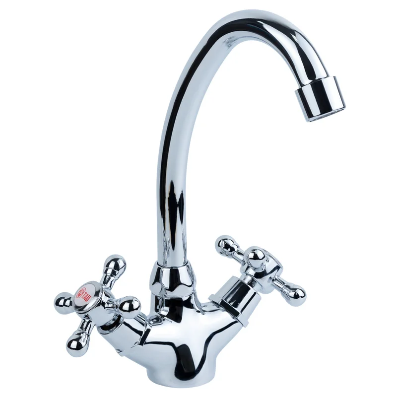 Модель VD-5B161C - це двухвентильний змішувач для кухні має поворотний J-подібний вилив висотою 245 мм, в який вбудований аератор. Завдяки багатошаровому хромонікелевому покриттю, кран захищений від іржавіння, дрібних пошкоджень і потускнения. Для позначення гарячої та холодної води вентилі прикрашені заглушками з червоним і синім логотипом TAU, відповідно.