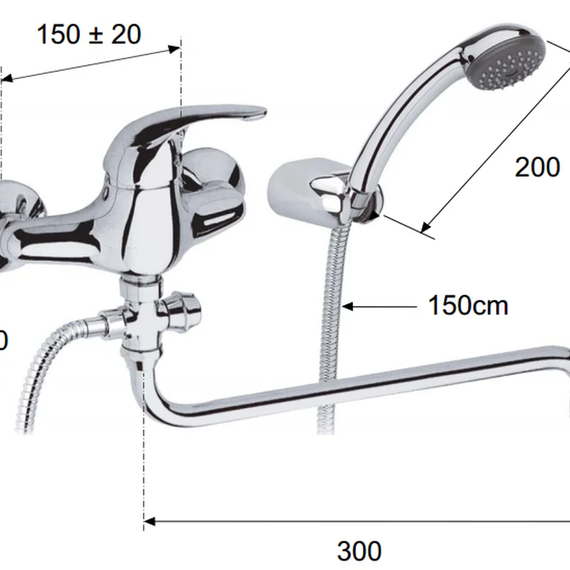 Змішувач із довгим вигнутим виливом, гнучкий шланг 1500 мм, ручний душ, тримач для душу в комплекті.