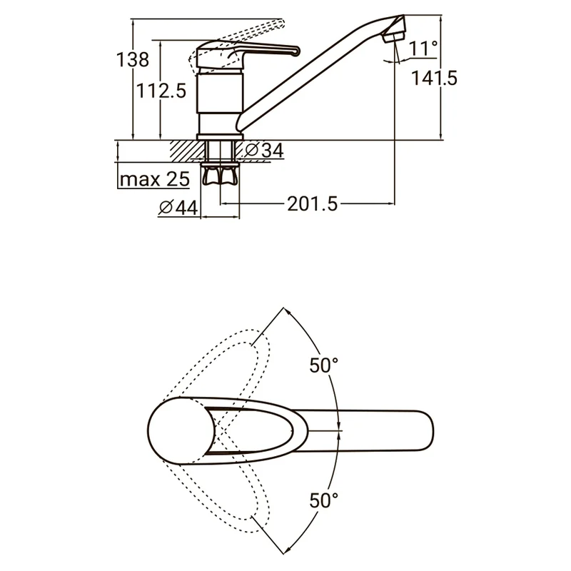 Монтаж змішувача для кухні Акватика виконується на горизонтальну поверхню за допомогою гайки. Підключення до магістралі проводиться через 2 гнучких підведення, які додаються в комплекті.
