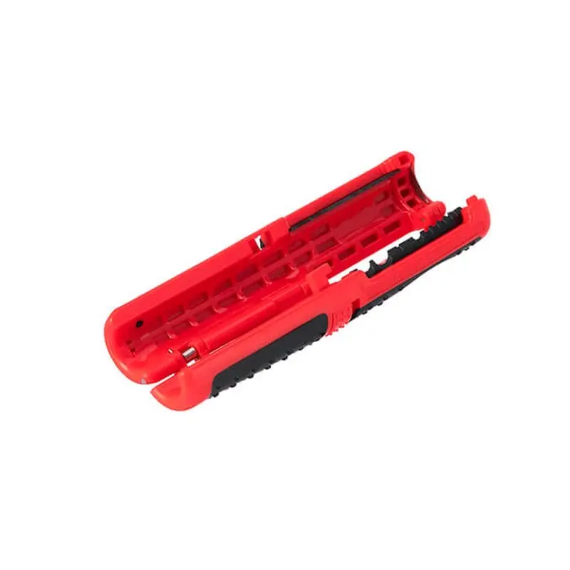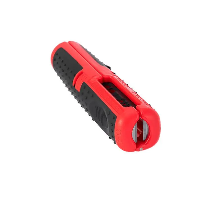 Зрізання оболонки відбувається максимально точно й швидко, без попереднього налаштування глибини різання, при цьому не ушкоджуються внутрішні жили кабелю. Компактні габарити знімача дозволяють акуратно знімати ізоляцію з проводів навіть у важкодоступних місцях і в обмежених умовах: на стелі та стінах, в освітлювальних і розподільчих коробках тощо.